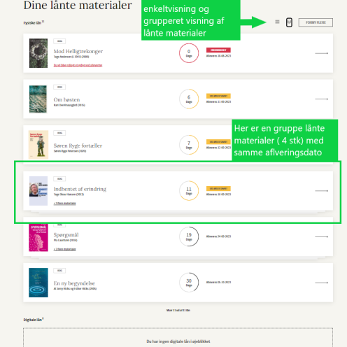 Her vises ”Overskredne lån”, ”Lån” og som noget nyt også dine ”Digitale lån”, så du har et samlet overblik.